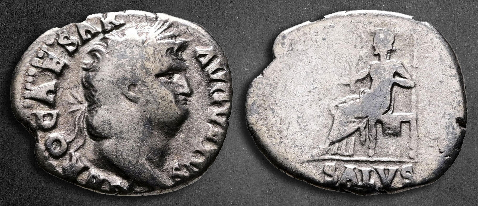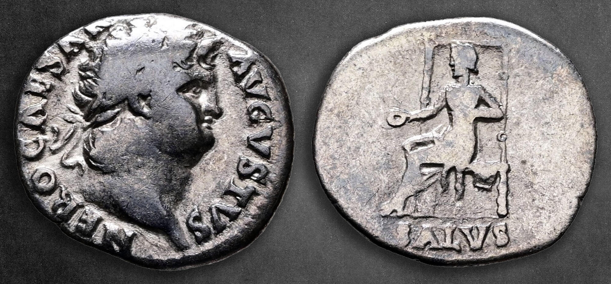 NERO CAESAR AVGVSTVS, laureate head right / SALVS, Salus seated left on ornamented throne, holding patera.