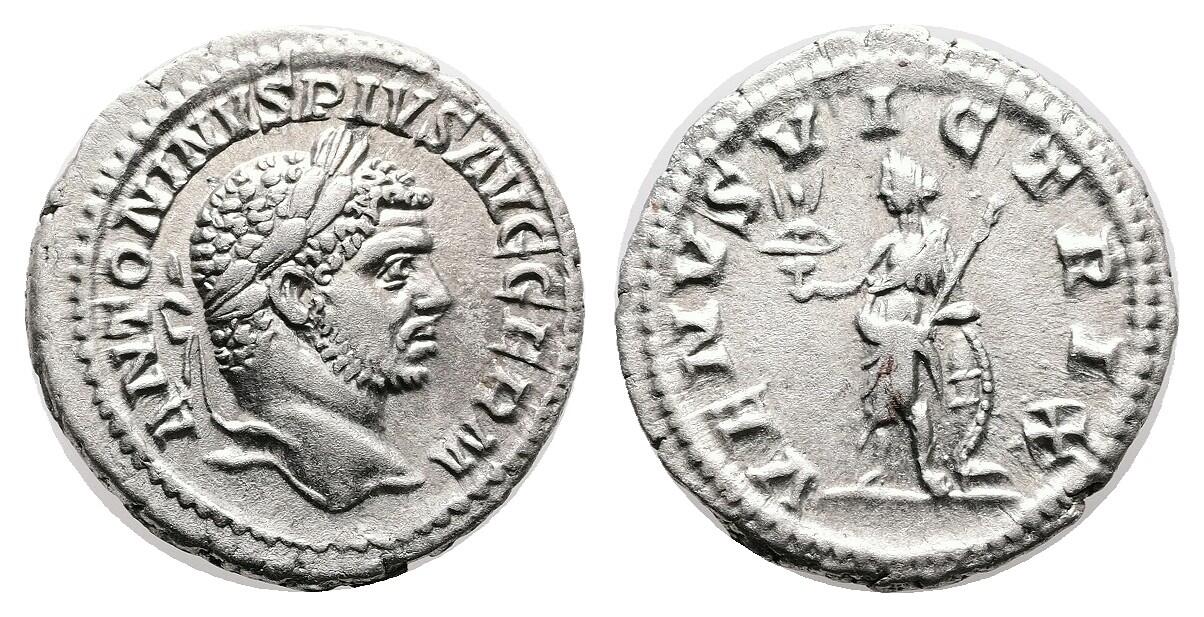 | Lot description: Roman Imperial Caracalla, AD 198-217. Silver Denarius (20 mm, 2.78 g.). Rome mint, struck 215-217 AD. ANTONINVS PIVS AVG GERM, laureate head of Caracalla to right. Rev. VENVS VICTRIX, Venus standing front, head to left, holding Victory in her right hand and long scepter in her left, her left elbow resting on shield set on helmet. BMC 82. Cohen 606. RIC 311b. Good very fine. Estimate: 40 EUR Starting price: 30 EUR |