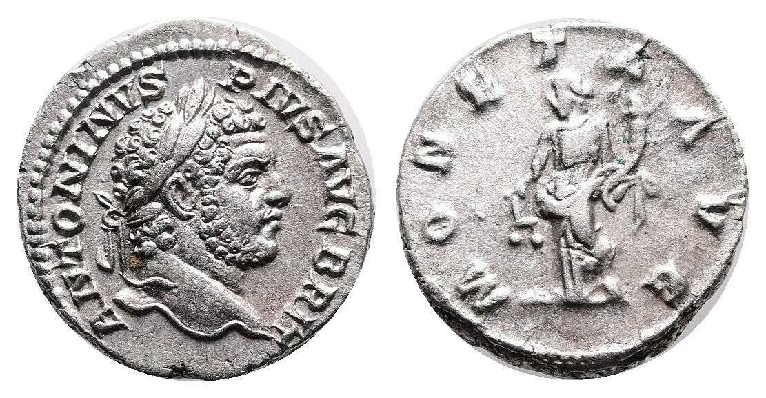 | Lot description: Roman Imperial Caracalla, AD 198-217. Silver Denarius (18 mm, 2.99 g.). Rome mint, struck 210-213 AD. ANTONINVS PIVS AVG BRIT, laureate head of Caracalla to right. Rev. MONETA AVG, Moneta standing front, head to left, holding scales with her right hand and a cornucopiae with her left. BMC 90. Cohen 165. RIC 224. Near extremely fine. Estimate: 40 EUR Starting price: 30 EUR |