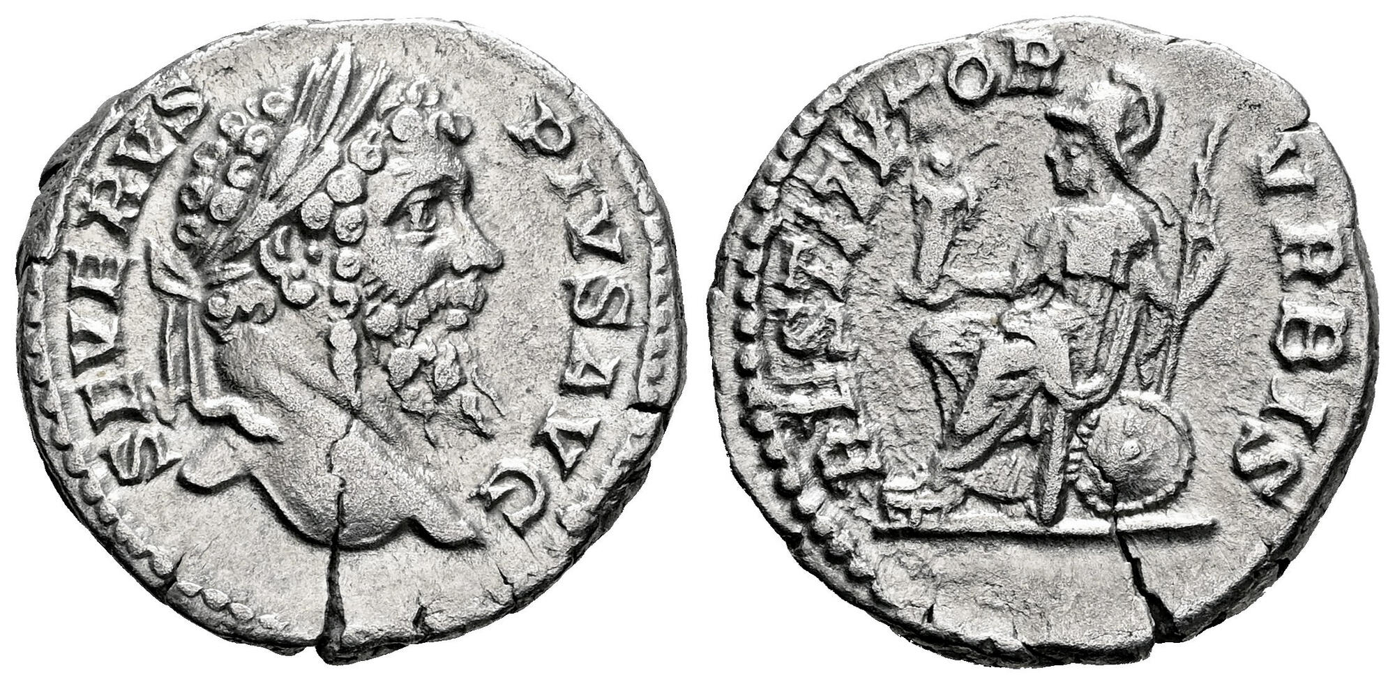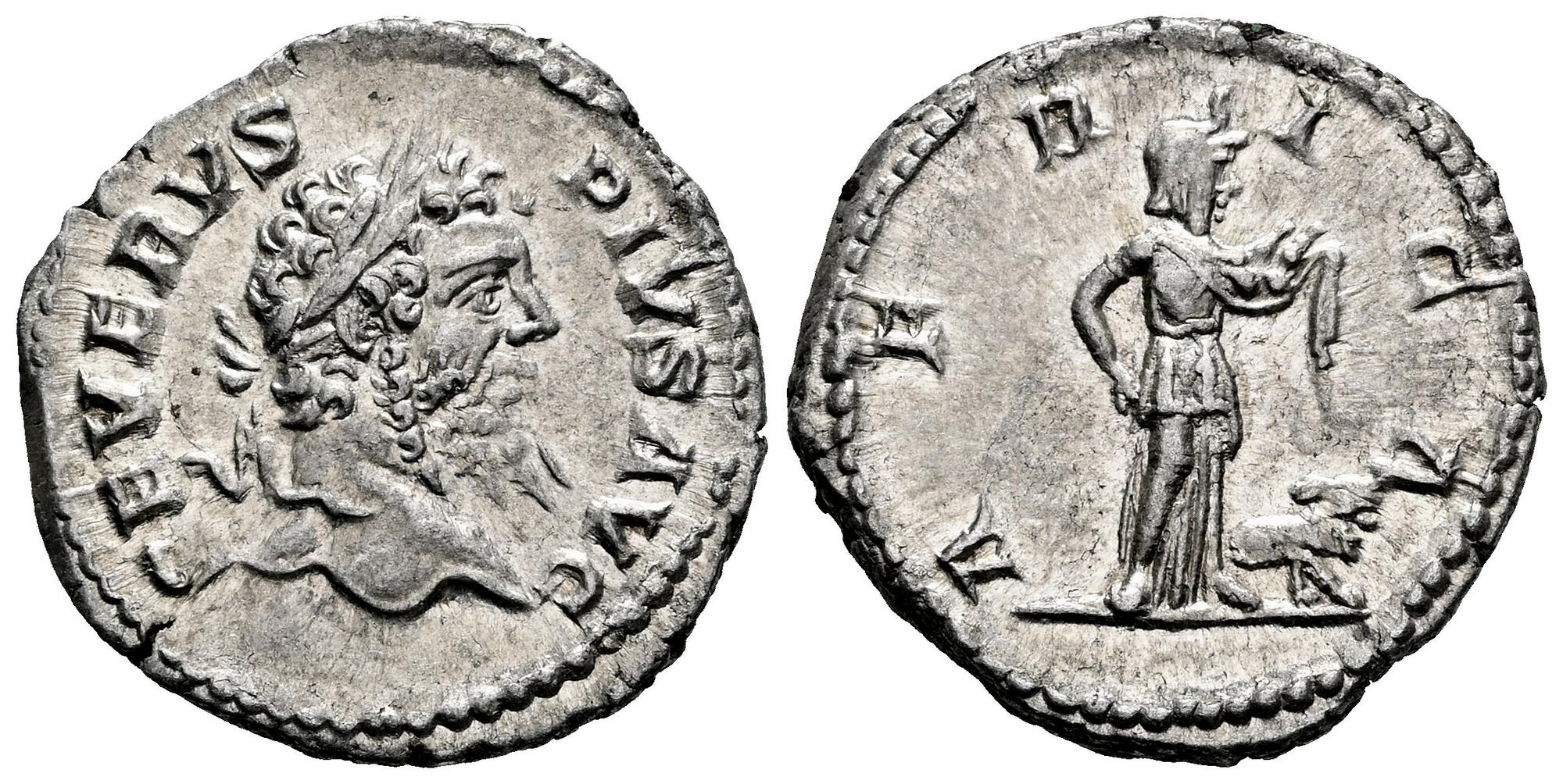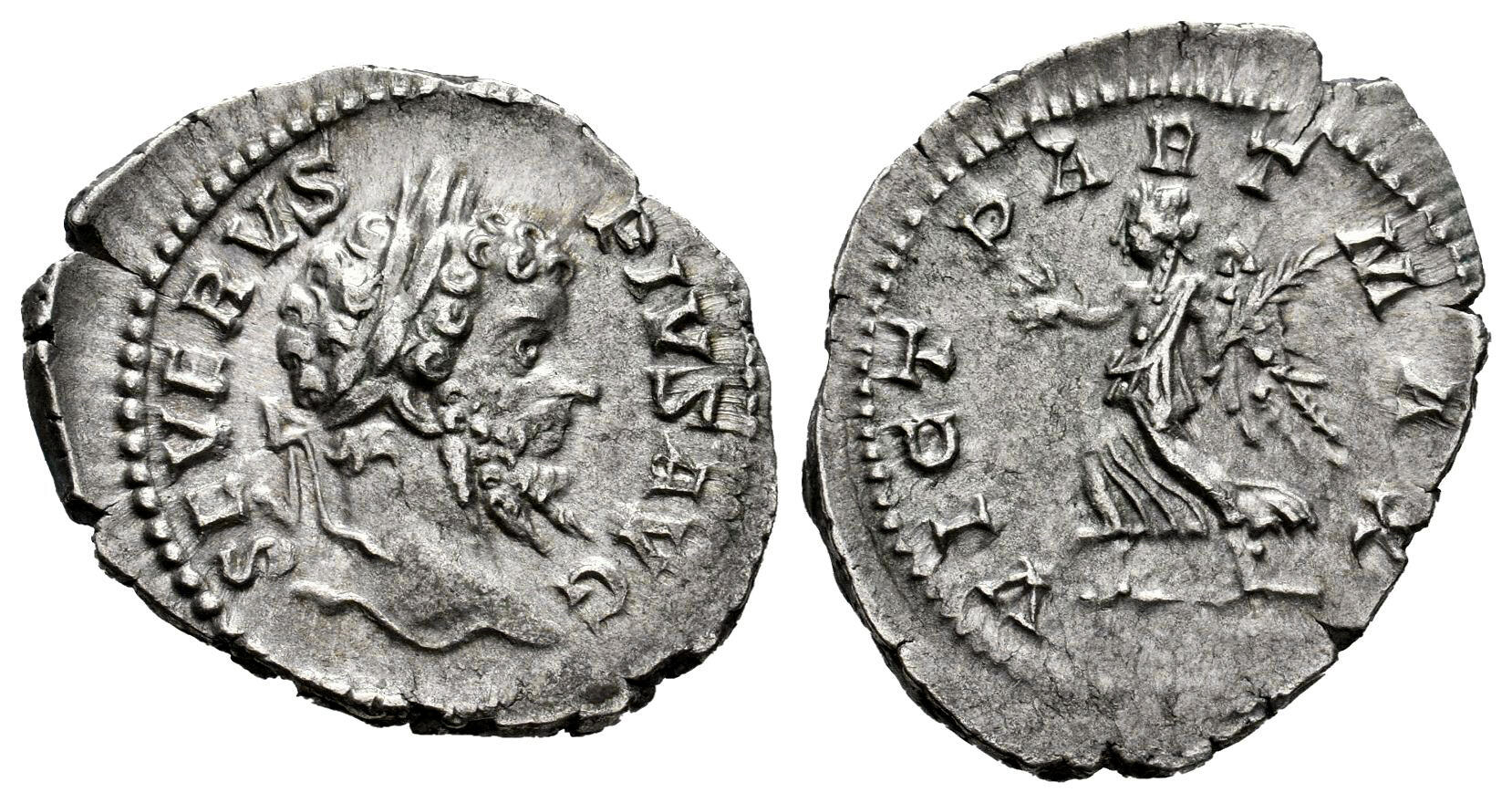 Spanish description: Septimio Severo. Denario. 207 d.C. Roma. (Ric-IV 207a). (Bmcre-530). (Rsc-493b). Anv.: SEVERVS PIVS AVG. Cabeza laureada a la derecha. Rev.: P M TR P XV COS III P P. África en pie mirando de frente, mirando a la derecha, con tocado de elefante, sosteniendo frutas y serpiente; a la derecha, león a la derecha. Ag. 3,05 g. Suave tono. Restos de brillo original. Ex Beasley Campgate Collection, VAuctions 236 (05/11/2009), lote 54. EBC-. Est...120,00. |  |