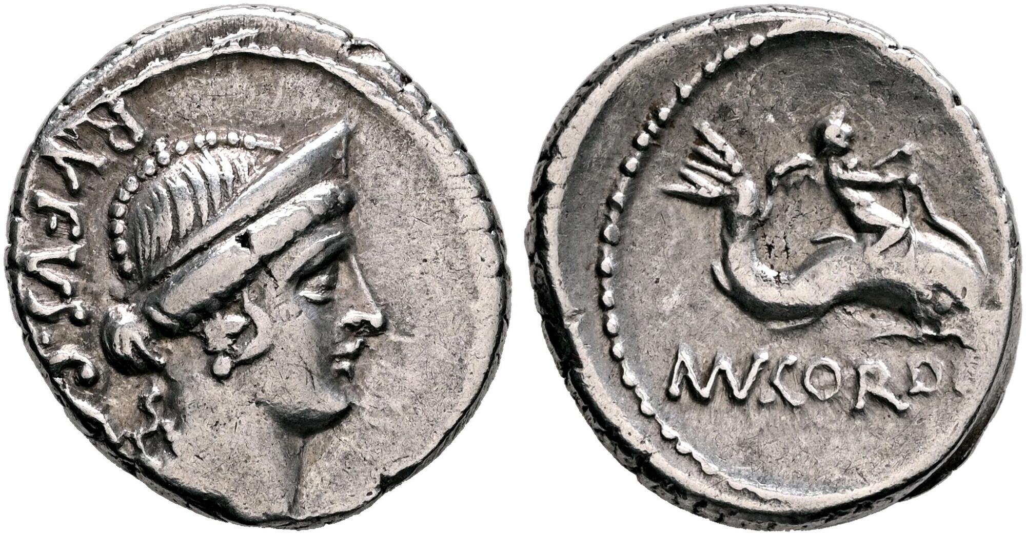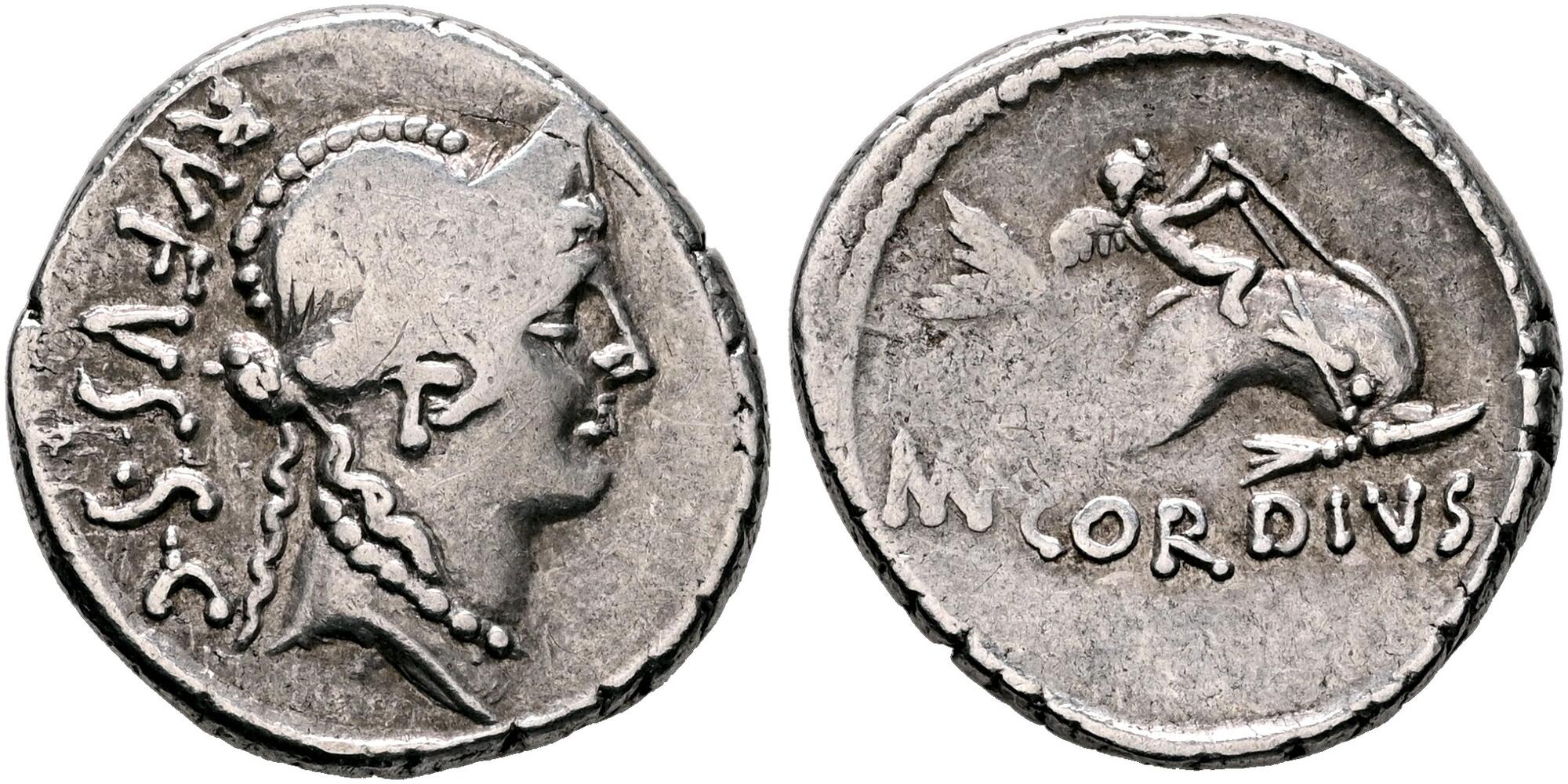 Mn. Cordius Rufus, 46 BC. Denarius (Silver, 18 mm, 3.46 g, 2 h), Rome. RVFVS•S[•C] Head of Venus to right, wearing diadem, pendant earring and pearl necklace. Rev. MN•CORDI[VS] Cupid riding on the back of a dolphin right, holding reins in both hands. Babelon (Cordia) 3. Crawford 463/3. CRI 65. RBW 1608. Sydenham 977. Areas of weakness, otherwise, very fine.