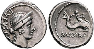 Mn. Cordius Rufus, 46 BC. Denarius (Silver, 18 mm, 4.07 g, 1 h). RVFVS∙S∙C Diademed head of Venus to right, wearing pendant earring and pearl necklace. Rev. MN CORDIVS Cupid riding on a bridled dolphin swimming to right. Babelon (Cordia) 3. Crawford 463/3. Sydenham 977. A pleasant coin with a most attractive reverse. Some die faults on the obverse, otherwise, nearly extremely fine.