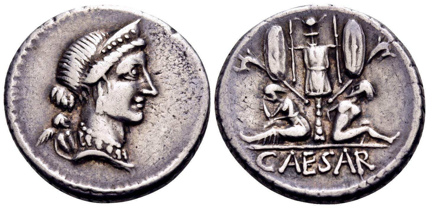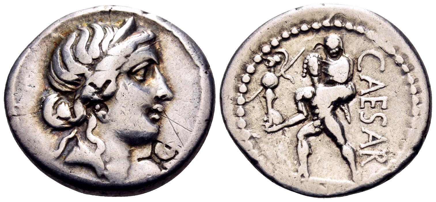Julius Caesar, 49-44 BC. Denarius (Silver, 19 mm, 3.98 g, 10 h), military mint (Utica?), 46. DICT•ITER - COS•TERT Head of Ceres to right, wearing wreath of grain ears. Rev. AVGVR - PONT•MAX Culullus, aspergillum, jug and lituus; to right, M (munus). Babelon (Julia) 16. Crawford 467/1b. RBW 1638. Sydenham 102. A lovely example, well centered and of attractive style. Small banker's mark on the obverse, otherwise, good very fine.