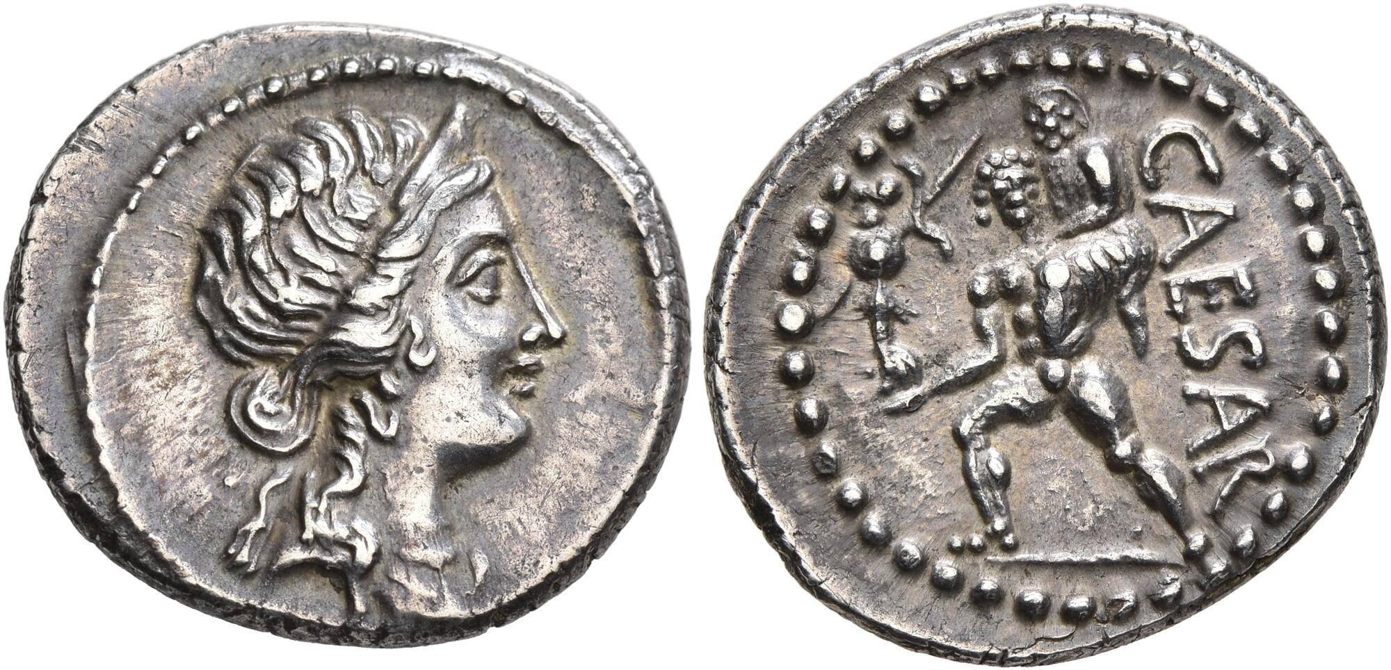 Julius Caesar, 49-44 BC. Denarius (Silver, 19 mm, 3.98 g, 6 h), military mint moving with Caesar in Africa, 48-47. Diademed head of Venus to right. Rev. CAESAR Aeneas advancing left, carrying palladium in his right hand and Anchises on his left shoulder. Babelon (Julia) 10. Crawford 458/1. CRI 55. RBW 1600. Sydenham 1013. A very well struck and beautifully toned example. Nearly extremely fine.