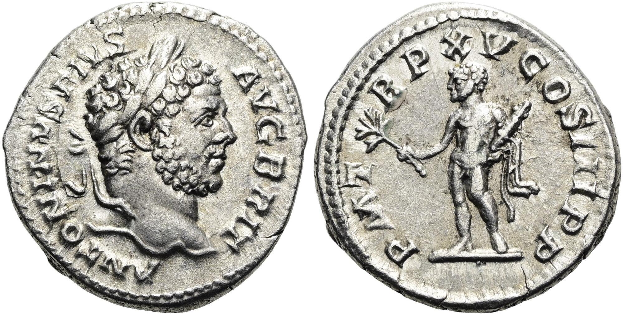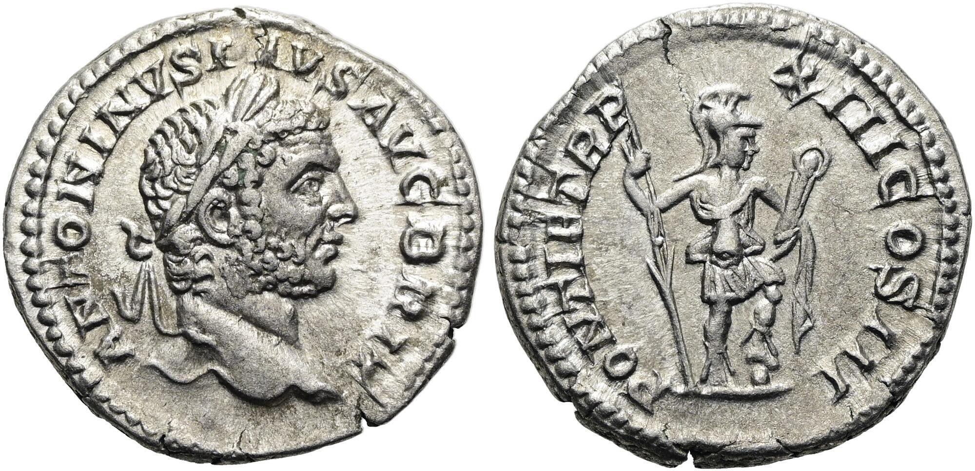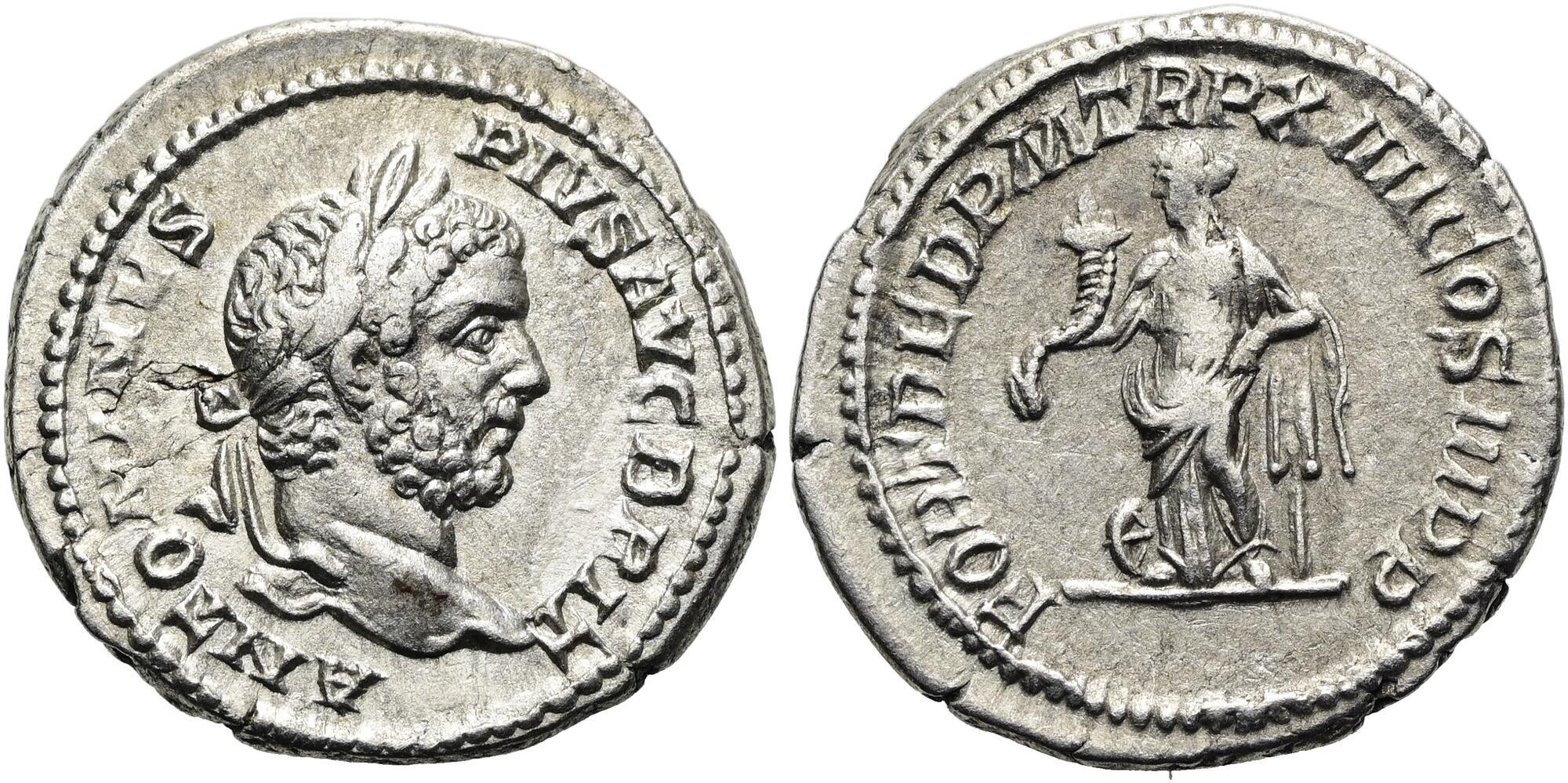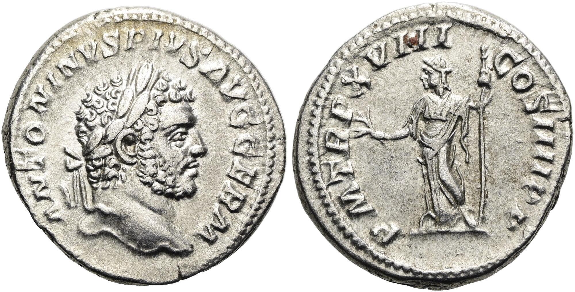 Caracalla, 197 - 217 n. Chr. Denar ø 20mm (3.04g). 211 n. Chr. Mzst.Rom. Vs.: ANTONINVS PIVS AVG BRIT, Kopf mit Lorbeerkranz n. r. Rs.: FORT RED P M TR P XIIII COS III P P, Fortuna Redux steht n. l., hält Füllhorn u. lehnt auf Ruder, l. unten Rad. RIC 189; C. 84; BMC 1. Vs. Schrötlingsfehler, vz.