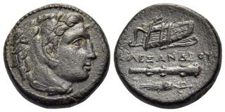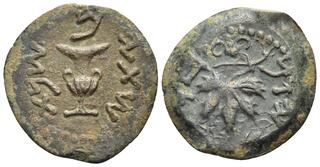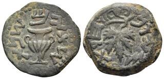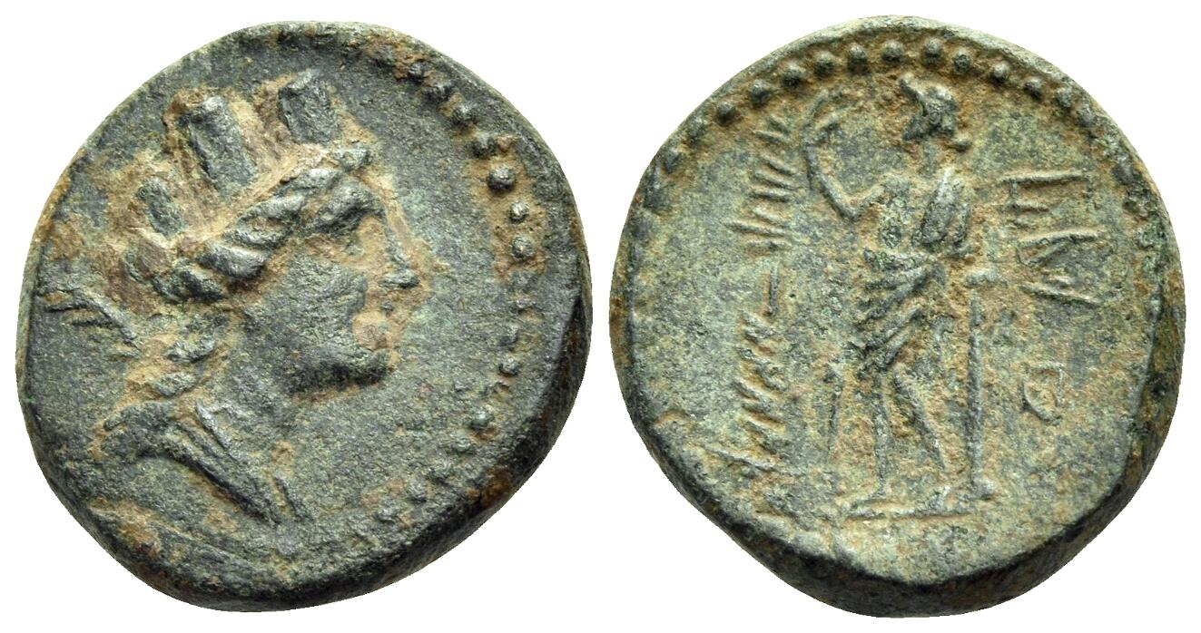 PHOENICIA. Marathos. 166/5-152/1 BC. (Bronze, 17 mm, 4.04 g, 12 h), dated year 108 of the Arados era = 152/1. Turreted and draped bust of Tyche to right, with palm branch over left shoulder. Rev. Marathos standing to left, resting left arm on column and holding aphlaston in his right hand; in left field, Phoenician date; in right field, Phoenician letters. DCA 833. Duyrat, Ateliers 312 var. (Phoenician letters). HGC 10, 202. Green patina with minor earthen encrustations. Some roughness and deposits, otherwise, good very fine.