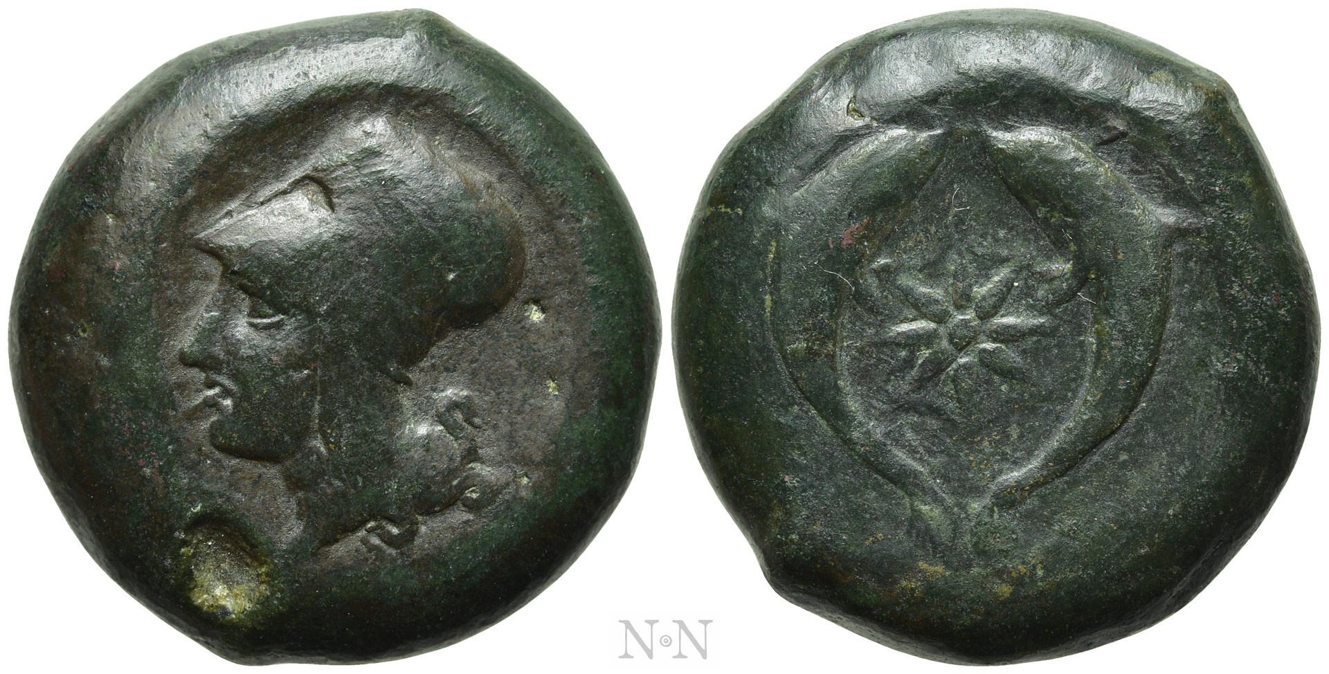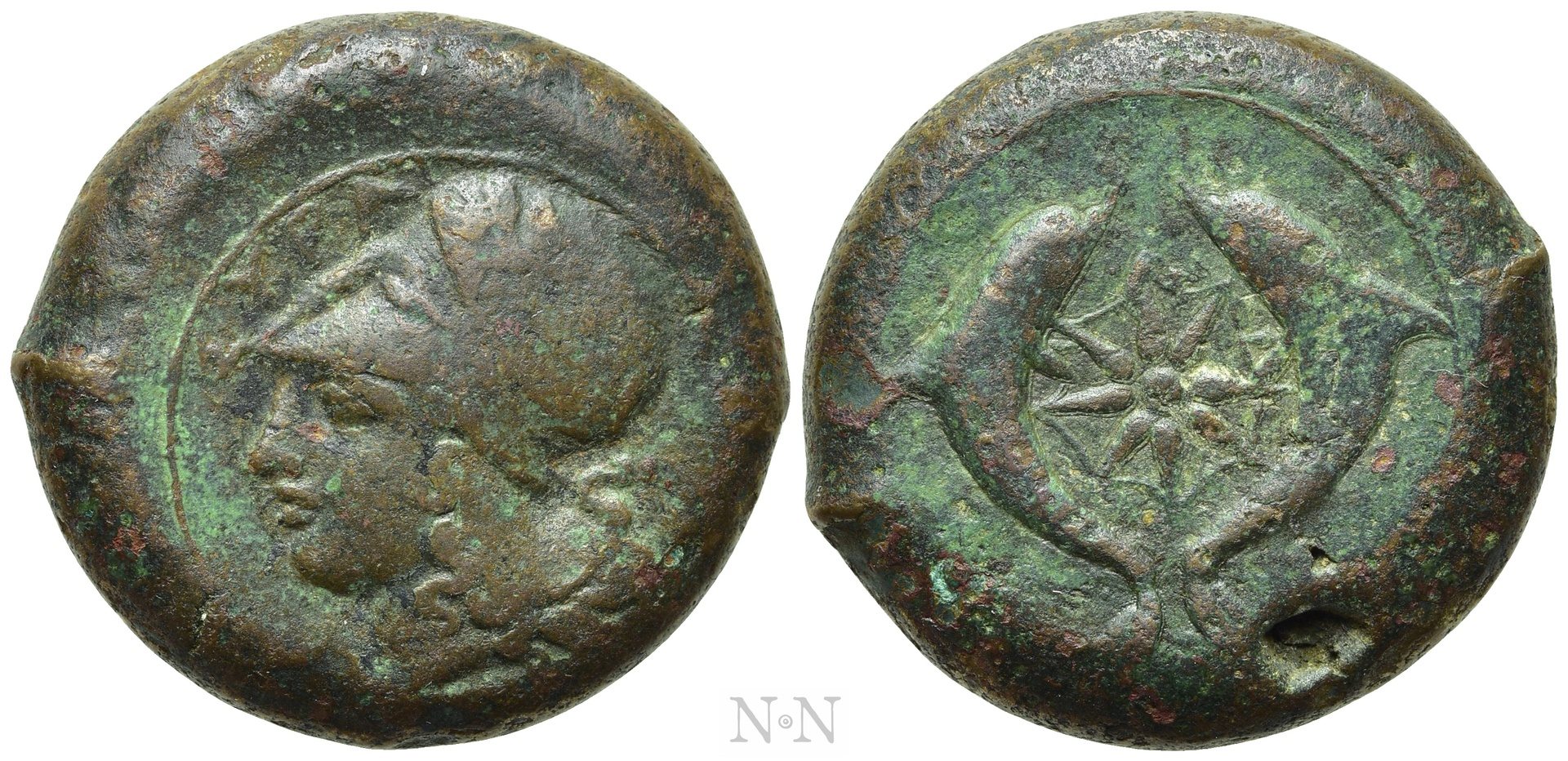 Stater circa 370-350, AR 26 mm, 11.99 g. Head of Hera r., wearing polos ornamented with five palmettes and single-pendant earring. Rev. ARΓEI-ON Two dolphins, one above the other, swimming in counterclockwise circle; in centre, Corinthian helmet r. between E – M. BCD Peloponnesos 1066 (this coin). JGC 5, 656. SNG Copenhagen –. BMC –. Traité III 617 = A. Löbbecke, Griechische Münzen aus meiner Sammlung IV in ZfN 17 (1890), p. 6 and pl. I, 8 (these dies).
