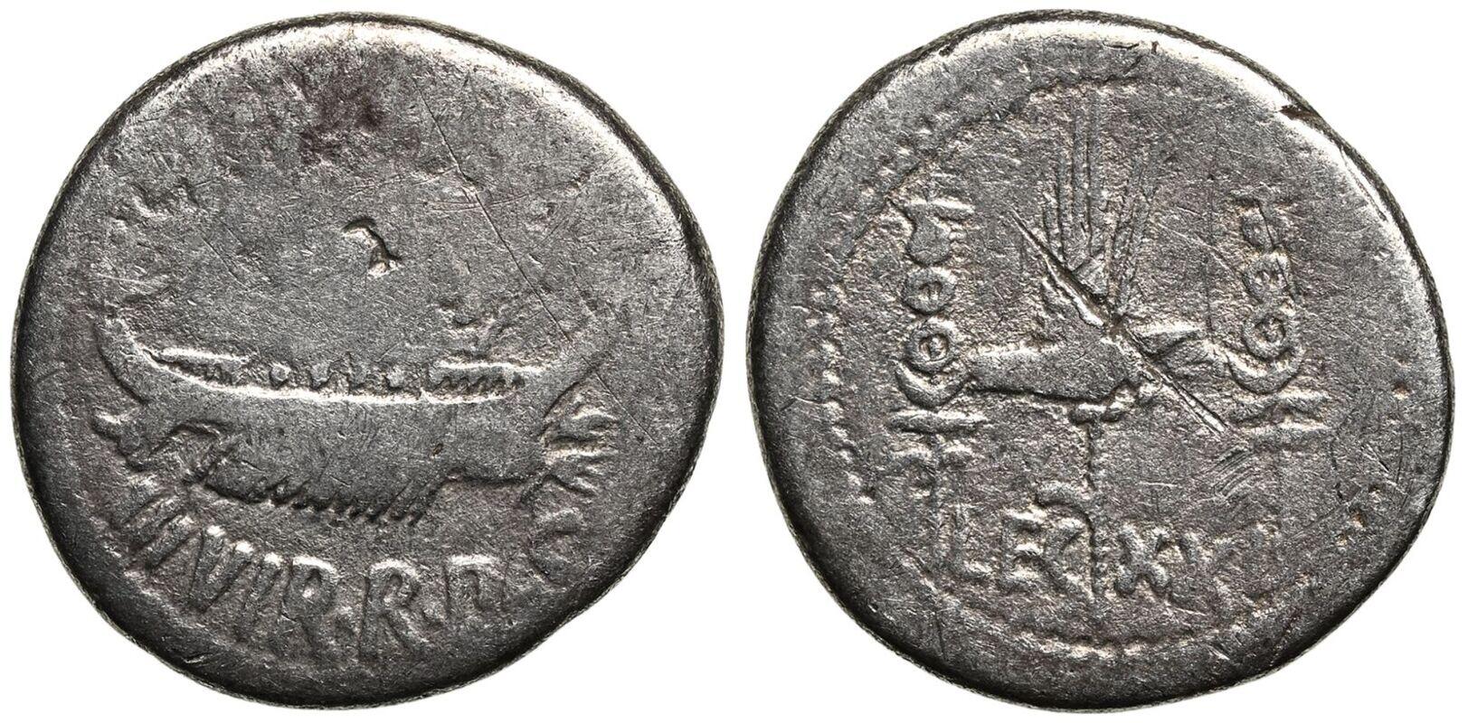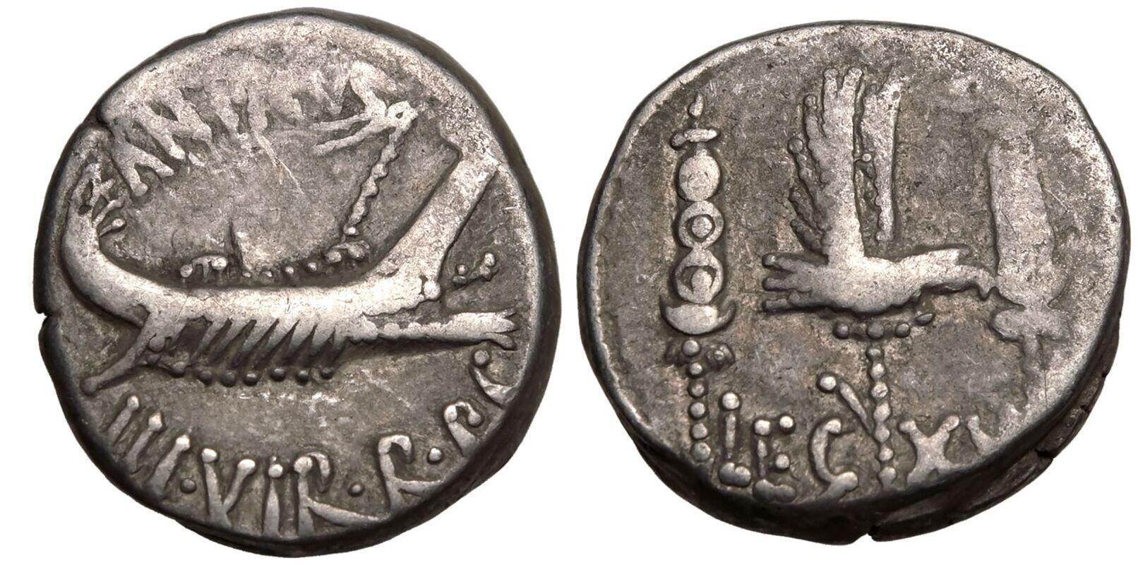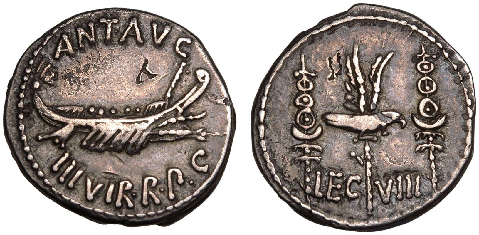 | Lot description: ROMAN REPUBLIC & IMPERATORIAL. Marc Antony. Silver Denarius, 32-31 BC. Military mint (Patrae?). Obv: ANT•AVG III• above, III VIR•R•P•C below, praetorian galley right. Rev: Aquila between two signa; LEG-XXI across fields. Very Fine. Reference: Crawford-544/37; RSC-58. Weight: 3.00g. Diameter: 18mm. Die Axis: 6h. PLEASE NOTE: A 20.00% buyer's premium will be charged separately. VAT on the buyer's premium may apply in accordance with UK regulations. Payment can be made in EUR, CHF, or USD for an exchange fee. Please contact us to find out more. Starting price: 60 GBP |