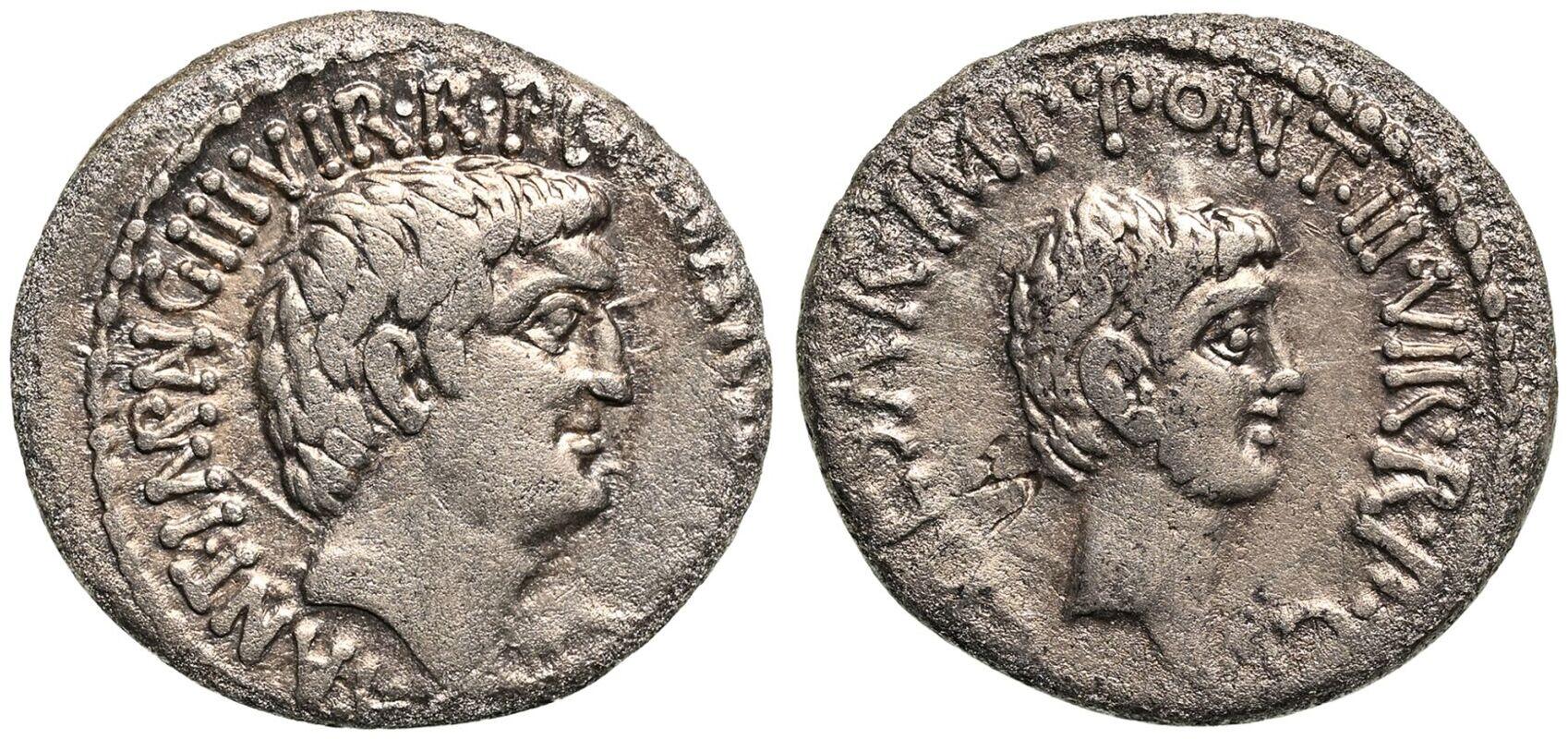 | Lot description: ROMAN REPUBLIC & IMPERATORIAL. Marc Antony & Octavian. Silver Denarius, 41 BC. Ephesus. M. Barbatius Pollio, Quaestor Pro Praetore. Obv: M•ANT•IMP•AVG•III•VIR•R•P•C•M BARBAT•Q•P (partially ligate), bare head of Antony right. Rev: CAESAR•IMP•PONT•III•VIR•R•P•C•, bare head of Octavian right. Good Very Fine; slightly porous, banker's mark to reverse. Reference: Crawford-517/2; CRI-243; RSC-8a. Weight: 3.47g. Diameter: 19mm. Die Axis: 6h. PLEASE NOTE: A 20.00% buyer's premium will be charged separately. VAT on the buyer's premium may apply in accordance with UK regulations. Payment can be made in EUR, CHF, or USD for an exchange fee. Please contact us to find out more. Starting price: 250 GBP |