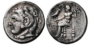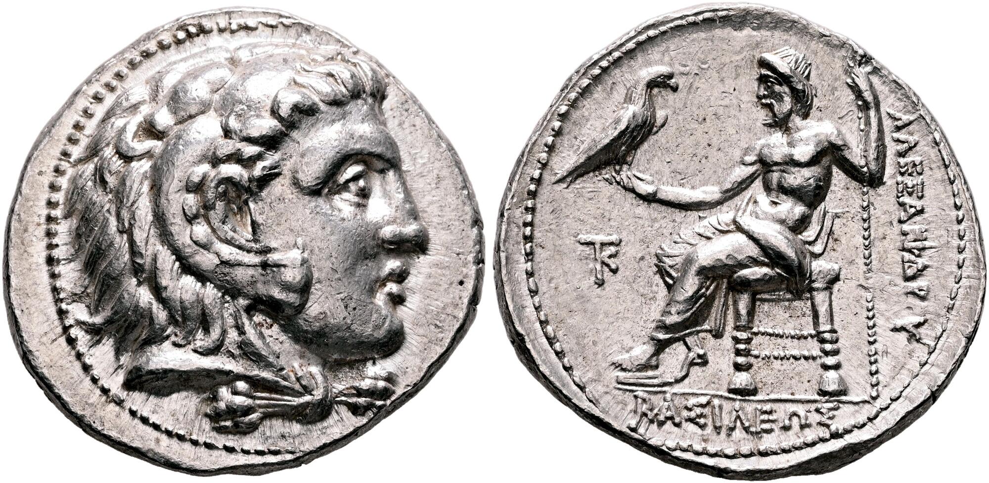 | Lot description: KINGS OF MACEDON. Alexander III 'the Great', 336-323 BC. Tetradrachm (Silver, 28 mm, 16.90 g, 12 h), Kyrene, circa 305-290. Head of Herakles to left, wearing lion skin headdress. Rev. AΛEΞANΔPOY Zeus seated left on low throne, holding long scepter in his left hand and eagle standing right with closed wings in his right; to left, monogram of IΠΟ. Price 3986. Very rare. Numerous light marks and minor areas of horn silver and with a scrape on the obverse, otherwise, nearly very fine. The extraordinarily rare Alexander tetradrachms from Kyrene are immediately recognizable by their striking left-facing Herakles. Alongside tetradrachms, the emission also included exceedingly rare gold staters and half staters in the Alexander-type (cf. Leu 19 (2025), 97) and numbers among the foremost rarities of Kyrenaican coinage, a series otherwise characterized by local types. The circumstances that gave rise to this remarkable issue - and the rationale for the left-facing portrait - are unknown, but it most likely belongs to the early Ptolemaic period. This lot cannot be shipped to a US address. Starting price: 500 CHF |