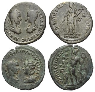 | Lot description: Lots. Markianopolis (Moesia Inferior). Macrinus und Diadumenianus (217 - 218 n. Chr.) / Philippus I. Arabs (244 - 249 n. Chr.) und Otacilia Severa. Lot (2 Stück): 2 Bronzen. Vs: Zwei Büsten einander gegenüber. Rs: Tyche mit Ruder und Füllhorn bzw. Apollon mit Bogen zwischen Köcher und Baum mit Schlange nach links bzw. rechts stehend. 9,18 g - 27 mm / 12,82 g - 27 mm. Sehr schön. Starting Price: 25 EUR |