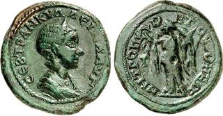 | Lot description: MOESIEN. TOMIS (Constantza). Tranquillina, Gemahlin Gordian III. 241-44. AE-Triassarion 24/25mm 8,75g. Drapierte Büste mit Diadem n. r. CEB TPANKVLLEINA AVG / MHTPO P O NT OV TOMEWC Nike steht v.v., Kopf n.l., hält Kranz und Palmzweig, im Feld G. AMNG 3557, Varb. 5736. . grüne Patina, ss Estimate: 60 EUR |