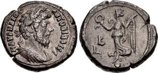 | Lot description: EGYPT, Alexandria. Marcus Aurelius. AD 161-180. BI Tetradrachm (23.8mm, 11.87 g, 11h). Dated RY 2 (AD 161/162). Laureate and draped bust right / Nike standing left on globe, holding wreath and palm frond; L B (date) to left. Köln –; Dattari (Savio) –; K&G –; Emmett 2068.2 (R5) = CNA II, lot 250 (this coin). VF, toned. Extremely rare type for this regnal year. From the New Orleans Collection, purchased from Nilus Coins (November 1999). Ex Classical Numismatic Auctions II (7 November 1987), lot 250. Estimate: 500 USD |