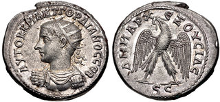 | Lot description: SELEUCIS and PIERIA, Antioch. Gordian III. AD 238-244. AR Tetradrachm (27mm, 12.68 g, 12h). Struck AD 238-240. Radiate, draped, and cuirassed bust left / Eagle standing facing, head and tail left, with wreath in beak and wings spread. Prieur 286; McAlee 867c (this coin illustrated). Good VF, toned with underlying luster. From the Michel Prieur Collection. Ex Carlo Fontana Collection (Finarte Casa D'Aste 995, 26 November 1996), lot 1183, purchased from C. Crippa, 1966. Estimate: 200 USD |