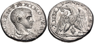 | Lot description: PHOENICIA, Tyre. Diadumenian. As Caesar, AD 217-218. AR Tetradrachm (25.5mm, 12.45 g, 12h). Laureate, draped, and cuirassed bust right / Eagle standing facing on club right, head and tail left, with wings spread, holding wreath in beak; murex shell between legs. Prieur 1560. VF, lightly toned with underlying luster, a touch of porosity. Extremely rare, five known to Prieur, and none in CoinArchives. From the Michel Prieur Collection. Ex Numismatica Ars Classica 46 (2 April 2008), lot 1129 (hammer 1100 CHF). When this coin was sold by NAC in 2008, they catalogued it as Prieur 1558, but Prieur reattributed it to his no. 1560. Estimate: 500 USD |