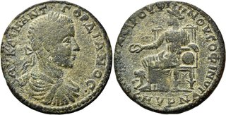| Lot description: IONIEN. SMYRNA. Gordian III., 238 - 244 n. Chr. AE Großbronze (19,00g). Unter dem Strategen und Sophisten Claudius Rufinus, 241 - 244 n. Chr. Vs.: ΑΥ ΚΑΙ Μ ΑΝΤ - ΓΟΡΔΙΑΝΟΣ, drapierte und gepanzerte Büste mit Lorbeerkranz n. r. Rs.: ΕΠΙ ΣΤΡ ΚΛΑΥΔΙΟΥ ΡΟΥΦΙ-ΝΟΥ ΣΟΦΙ / ΣΜΥΡΝΑΙΩΝ, Kybele mit Mauerkrone n. l. thronend, in der Rechten Patera haltend, der l. Arm ruht auf einem Tympanon; an ihrer Seite Löwe n. l. sitzend. Klose, Smyrna . RPC VII . RR! Grüne Patina, ss Aus süddeutschem Privatbesitz, Slg. E. L.; ex Münzen & Medaillen Deutschland, Auktion 32, 26. Mai 2010, Nr. 237. Estimate: 350 EUR |