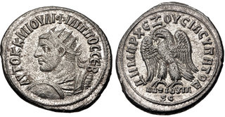 | Lot description: SELEUCIS and PIERIA, Antioch. Philip I. AD 244-249. AR Tetradrachm (27mm, 10.95 g, 6h). Struck AD 248-249. Radiate, draped, and cuirassed bust left, holding round shield ornamented with aegis / Eagle standing left, with wings spread, holding wreath in beak; ANTIOXIA/S C in two lines in exergue. Prieur 450; McAlee 960. Lightly toned with underlying luster, some minor porosity. Near EF. Extremely rare, seven known to Prieur, and four in CoinArchives. From the Michel Prieur Collection. Estimate: 150 USD |