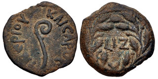 | Lot description: JUDAEA, Procurators. Pontius Pilate. 26-36 CE. Æ Prutah (15mm, 2.01 g, 8h). Jerusalem mint. Dated RY 17 of Tiberius (30/1 CE). Lituus / L IZ (date) within wreath. RPC I 4968; Meshorer 333; Hendin 1342. Dark green-brown patina with light earthen highlights/deposits. Good VF. Exceptional centering and strike for issue. Estimate: 200 USD |