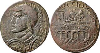 | Lot description: CARIA. Antiochia ad Maeandrum. Gallienus, 253-268. Hexassarion (Bronze, 36 mm, 22.33 g, 6 h). [AY K ΠΟ ΓAΛΛI]HNOC Radiate, helmeted, draped and cuirassed bust of Gallienus to left, seen from behind, holding spear and shield. Rev. ANTIOXЄΩN Bridge of six arches spanning the Maeander, with monumental gateway to left and river-god Maeander reclining left on bridge, holding reed in his right hand and cornucopiae in his left. BMC 57 var. (stork on gateway). SNG Leypold 797. SNG München 92 var. (stork on gateway). SNG von Aulock 2430 var. (stork on gateway). Minor areas of weakness, otherwise, good very fine. The monumental bridge shown on the reverse of this coin is probably the bridge mentioned, en passant, by Strabo, before he goes on to praise the famous dried figs of the Carian Antiochia (Strabo XIII 4,15). Starting Price: 75 CHF |