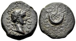 | Lot description: THRACE. Byzantium. Tiberius, 14-37. Hemiassarion (Bronze, 16 mm, 3.03 g, 12 h). TIBEPIOC KAI CEBACTO[C] Laureate head of Tiberius to right. Rev. Six-pointed star within crescent. RPC -. Schönert-Geiss - (but cf. 1315-7 of Domitian, which shares the same rev. type and is similar in style). Seemingly unpublished. Dark green patina. Roughness on reverse, otherwise, nearly extremely fine. The attribution to Byzantium is by no means certain: the large bronze denomination of Tiberius from that mint exhibits a highly refined engraving style, and furthermore it does not employ the lunate Σ as seen on this coin. However, the reverse of a six-pointed star within crescent is found on small bronzes of Domitian that share a similar style and also the lunate Σ. Starting Price: 50 CHF |