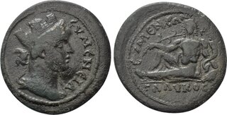 | Lot description: PHRYGIA. Eumenea. Pseudo-autonomous (2nd century). Ae. Obv: ЄVMЄNЄIA. Turreted and draped bust of Tyche right. Rev: ЄVMЄNЄΩN / ΓΛAVKOC. River god Glaukos reclining left, holding reed and cornucopia, and resting elbow upon overturned urn from which liquid flows. RPC 2967; SNG Copenhagen 387; BMC 28. Condition: Fine. Weight: 3.72 g. Diameter: 21 mm. Estimate: 40 EUR |
