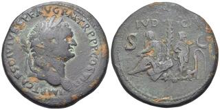 | Lot description: Titus, 79-81. Sestertius (Orichalcum, 35 mm, 24.26 g, 6 h), Judaea Capta series, Balkan mint, probably Perinthus in Thrace, 80-81. IMP T CAES DIVI VESP F AVG P M TR P P P COS VIII Laureate head of Titus to right. Rev. IVD - CAP / S C Mourning Judaea, seated to left on shields beneath palm tree; to right, male captive with his hands bound behind his back, standing to right, looking back at Judaea; to right, pile of arms. Cahn 3. Hendin 1596. RIC² 500. RPC 503. Rare. Black surfaces with scattered deposits. Very fine. Starting Price: 400 CHF |