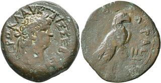 | Lot description: EGYPT. Alexandria. Nero, 54-68. Diobol (Bronze, 26 mm, 8.38 g, 12 h), RY 13 = 66/7. ΝΕΡΩ ΚΛΑΥ ΚΑΙΣ ΣΕΒ ΓΕΡ Laureate head of Nero to right. Rev. [ΑΥ]ΤΟΚΡΑ / L ΙΓ Eagle with closed wings standing right. Dattari (Savio) 6658. Emmett 148.13. K&G 14.102. RPC I 5304. Rare. Areas of weakness, otherwise, good fine. From the Rhakotis Collection, formed in the 1960s and 1970s (with collector's ticket). Starting Price: 25 CHF |