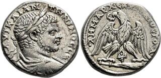 | Lot description: PHOENICIA. Tyre. Caracalla, 198-217. Tetradrachm (Billon, 25 mm, 12.28 g, 5 h), 213-217. ΑΥΤ ΚΑΙ ΑΝΤⲰΝΙΝΟC CЄ Laureate, draped and cuirassed bust of Caracalla to right, seen from behind. Rev. •ΔΗΜΑΡΧ•ЄΞ•Υ[ΠΑ]ΤΟC TO•Δ• Eagle with spread wings standing facing on club, head to left and holding wreath in beak; between the eagle's legs, murex shell. Prieur 1551. Light weakness on the reverse, otherwise, extremely fine. Starting price: 25 CHF |