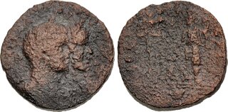 | Lot description: JUDAEA, Aelia Capitolina (Jerusalem). Elagabalus, with Severus Alexander as Caesar. AD 218-222. Æ (22.5mm, 7.56 g, 11h). Jugate busts of Elagabalus and Severus Alexander right, both laureate, draped, and cuirassed / Tyche standing left, resting right foot on wine jug, holding small bust and scepter; aquila and altar to left, wine cup in exergue. Meshorer, Aelia 142; Rosenberger 82; RPC VI Online 9076; Sofaer 130. Rough brown surfaces. Fair. Very rare, three known to RPC. Estimate: 100 USD |