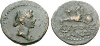 | Lot description: CILICIA, Augusta. Julia Augusta (Livia). Augusta, AD 14-29. Æ 18mm (3.46 g, 12h). Struck after AD 20. Draped bust right / Capricorn left, holding globe; star above. RPC 4007.17 (this coin); Karbach, Augusta 7; SNG France 1891; SNG Levante -. VF, black-green patina. From the Patrick Villemur Collection. Estimate: 150 USD |