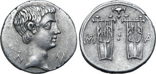 | Lot description: Augustus AR Drachm of Masicytus, Lycia. 27-20 BC. Bare head to right; Λ-Υ across fields / Two citharas; plectrum above and M-A across fields. RPC I 3309c; SNG von Aulock 4356; Troxell, Lycian League, 119. 3.60g, 19mm, 12h. Extremely Fine. From the inventory of a German dealer. Estimate: 400 GBP |