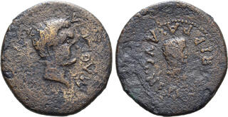 | Lot description: Agrippa, with Agrippa Postumus (son of Agrippa and grandson of Augustus), Æ 23mm of Apamea, Bithynia. Struck under Augustus, circa 12 BC - AD 14. M AGRIPPA TR POT C I C, bare head of Agrippa to right / AGRIPPA AVG NEPO, bare head of Agrippa Postumus to right. RPC I 2011; Naumann 75, 340; Pecunem - Naumann 37, 428 (hammer: EUR 1,300). 5.53g, 23mm, 12h. Good Fine; some areas of corrosion. Extremely Rare; seemingly just the third specimen to come to auction in the past two decades. From the collection of a Romanophile; Acquired from London Ancient Coins Ltd. Estimate: 150 GBP |