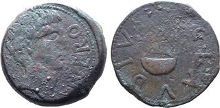 | Lot description: Tiberius, as Caesar, Ӕ "Sestertius" of Gades, Hispania. Struck under Augustus, after 12 BC. NERO, bare head to right / TI CLAVDIVS, simpulum to left. RPC I 89; ACIP 3319 (same dies as illustration); Vives 79-2. 45.53g, 37mm, 6h. Near Very Fine. Exceedingly Rare; just one other example on CoinArchives, seemingly one of fewer than ten known specimens. From the collection of a Romanophile; Ex Roma Numismatics Ltd., Auction XII, 29 September 2016, lot 427 (hammer: £1,300). Estimate: 1000 GBP |