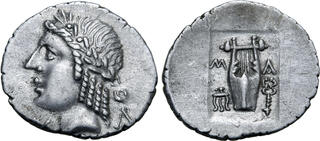 | Lot description: Lykian League, Masikytes AR Hemidrachm. After 18 BC. Laureate head of Apollo to left; Y-Λ across fields / Kithara; M-A across upper fields, trident head to left, kerykeion to right; all within shallow incuse square. Troxell, Period IV, Series 7, 158; Müseler XI, 54. 1.74g, 17mm, 12h. Extremely Fine; light cabinet tone. Estimate: 100 GBP |