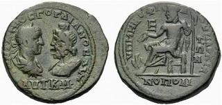 | Lot description: RÖMISCHE KAISERZEIT Gordianus III. 238-244 Lokalbronze (12,72g). Markianopolis (Moesia Inferior), Mag. Tull. Menophilus, 238-244 n.Chr. Av.: Büste des Kaisers mit Lorbeerkranz, Drapierung und Kürass sowie Büste des Serapis mit Kalathos und Drapierung vis-à-vis. Rv.: Zeus mit Patera und Szepter auf Sella n.l., davor Adler, im l. Feld E. -- Oberflächen minimal rauh, leichte Prägeschwäche am Rd., schwarz-grüne Patina. Varbanov 2029/2030var (Av.-Leg.). s.sch. Estimate: 55 EUR |