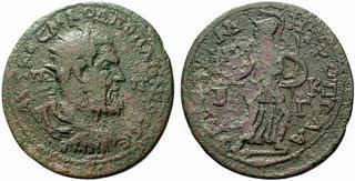 | Lot description: Griechische Münzen unter Römischer Herrschaft KILIKIEN TARSOS. Pupienus, 238. Grossbronze. Drap., gep. Büste mit Strkr. n. r. Rv. TARCOU M-HTROPOL A/M-K / B-G Athena in Peplos und Chiton und mit Helm n. r. eilend, Kopf n. l., mit der Linken Schild und Lanze haltend, auf der Rechten kranztragende Nike. 24,09 g. SNG BN Paris 1636 (stgl.). SNG Levante 1116 (Av. stgl.). Dunkle, olivgrüne Patina mit rotbrauner Auflage. Knapp sehr schön Estimate: 150 EUR |
