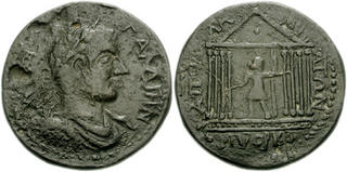 | Lot description: Roman Provincial PISIDIA, Apollonia Mordiaeum. Gallienus. 253-268 AD. Æ Medallion (40mm, 27.23 gm). Laureate, draped and cuirassed bust right, viewed from the front / ΑΠΟΛ−ΛΩ−ΝΙ−ΑΤΩΝ around, ΛV ΘΡ ΚΟ in exergue, Gallienus standing let within octastyle temple. SNG France 1365-6 (same dies); SNG von Aulock 4999; BMC Pisidia pg. 203, 5-6. VF, black-brown surfaces, pitted. From the Garth R. Drewry Collection. Purchased from B. A. Seaby, August 1973. Estimate: $200 |