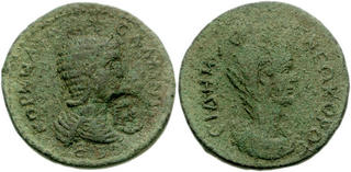 | Lot description: Roman Provincial PAMPHYLIA, Side. Salonina, wife of Gallienus. Augusta, AD 254-268. Æ 32mm (18.18 g). Diademed and draped bust right; c/m: E within incuse circle / CΙΔΕ ΜVCTIC Ν−Ε−ΩΚΟΡΩΝ, turreted and veiled bust of city-goddess right. SNG von Aulock -; c/m: Howgego 805. Fine, thick green patina, usual roughness. From the Garth R. Drewry Collection. Estimate: $75 |