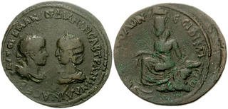 | Lot description: Roman Provincial MESOPOTAMIA, Nisibis. Gordian III, with Tranquillina. AD 238-244. Æ 33mm (17.97 g). Laureate, draped and cuirassed bust of Gordian III on left vis à vis diademed and draped bust of Tranquillina on right / [CEΠ Κ]ΟΛO N-ECIBI MHTPO, Tyche seated left on rocks, holding branch; Aries leaping left above, river-god below. BMC Arabia pg. 121, 14; SNG Copenhagen 238. VF, dark brown and green patina. From the Garth R. Drewry Collection.. Estimate: $100 |