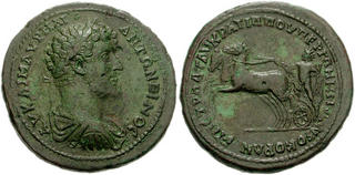 | Lot description: Roman Provincial MYSIA, Pergamum. Marcus Aurelius. 161-180 AD. Æ Medallion (41mm, 35.58 g). A. Tullius Cratippus, strategus. Laureate, draped, and cuirassed bust right / Helios in quadriga galloping left. SNG France -; SNG Copenhagen -; SNG von Aulock 1404. Good VF, green patina, repaired small pits in obverse field, minor smoothing in reverse fields, minor enhancement to portrait. Rare. Ex Garth R. Drewry Collection (Classical Numismatic Group 69, 8 June 2005), lot 984. Estimate: $1000 |