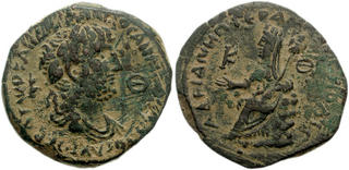 | Lot description: Roman Provincial SYRIA, Decapolis. Petra. Hadrian. AD 117-138. Æ 27mm (16.82 g). Dated CY 29 (AD 134/135). Laureate and draped bust right; K-Θ across field / Tyche seated left on rocks, holding trophy; K-Θ across field. Rosenberger 4; Spijkerman 5; SNG ANS -. VF, dark green patina under earthen encrustation, some cleaning scratches. Estimate: $200 |