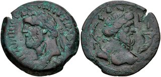 | Lot description: Roman Provincial EGYPT, Alexandria. Antoninus Pius. AD 138-161. Æ Drachm (33mm, 22.37 g, 12h). Dated RY 22 (AD 158/9). Laureate head left / Bust of Nile right, crowned with lotus, slight drapery on far shoulder, holding reed and cornucopia; L B-K (date) across upper field. Köln -; Dattari (Savio) 2724 (this coin); K&G -. VF, brown and green patina. Rare with head left on obverse. From Collection CR. Ex Dattari Collection, no. 2724. Estimate: $150 |