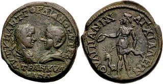 | Lot description: PROVINZIALPRÄGUNGEN Thrakien Anchialos Gordianus III., 238-244, und Tranquillina Bronze 241/244. 13.27 g. Beider Büsten einander gegenüber / Artemis mit Phiale und Bogen neben Hirsch. Münzer/Strack, Thrakien, S. 284, 657 Varbanov 744 Braungrüne Patina Sehr schön Estimate: 100 EUR |