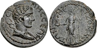 | Lot description: PISIDIA, Termessus Major. Pseudo-autonomous issue. 2nd to 3rd centuries AD. Æ (28mm, 11.51 g, 12h). Bareheaded and draped bust of Hermes right, caduceus over shoulder / Athena standing left, holding Nike and spear; at feet to left, shield set on ground. Von Aulock, Pisidiens -; SNG France 2178; SNG von Aulock 5351 var. (Athena holding patera). Good VF, black-green patina with earthen overtones. From Group CEM. Estimate: 150 USD |