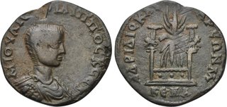 | Lot description: CILICIA. Diokaisareia. Philip II (247-249). Ae. Obv: M IOYΛIOC ΦIΛIΠΠOC K CEB. Bare-headed, draped and cuirassed bust right. Rev: AΔPIΔIOKAICAPEΩN M KENA. Thunderbolt on throne. SNG France 886 var. (reverse legend). Condition: Very fine. Weight: 12.6 g. Diameter: 31 mm. Estimate: 100 EUR |