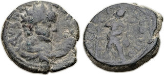 | Lot description: Ancients Nysa Scythopolis. Decapolis. Elagabalus (218 - 222 AD). AE (23mm, 8.88 gm, 6h). AV K M AYP ANTWNINOC, radiate, draped bust of Elagabalus right / NVCA KVΘΟΠΟ, Tyche of Nysa seated on throne right, holding infant Dionysus in her arms. Sofaer plate 151, 51. Rosenberger 46 variety. Rare. Dark green patina with light earthen fields. Very Fine.From The Dr. Patrick Tan Collection Estimate: 250-320 USD Estimate: 250 USD |