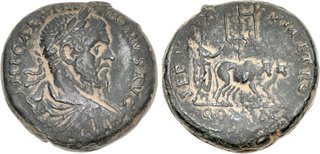 | Lot description: PHOENICIA, Tyre. Macrinus. AD 217-218. Æ (31mm, 24.91 g, 12h). Laureate, draped, and cuirassed bust right / Emperor plowing right with yoke of oxen; in background, vexillum inscribe LEG/III/GAL. Unpublished in the standard references. VF, dark green surfaces with earthen deposits, very minor tooling. Possibly a unique type for Macrinus. See CNG Electronic Auction 257, lot 300 for a temple type from the same obverse die. This reverse type is known on coins of Septimius Severus and Julia Domna (cf. Rouvier 2300-1), but is heretofore unknown for Macrinus. Estimate: 500 USD |