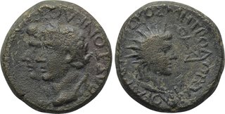 | Lot description: LYDIA. Tripolis. Tiberius (14-37). Ae. Menandros Metrodoros Philokaisar, magistrate. Obv: [...]ΣΕΒΑΣΤOΝ ΚΑΙΣΑΡΑ[...]. Laureate head of Tiberius and draped bust of Livia jugate left. Rev: ΜΕΝΑΝΔΡΟΣ ΜΗΤΡΟΔΟΡΟΥ ΦΙΛΟΚΑΙΣΑΡ / TO Δ. Radiate head of Helios right. RPC I 3054. Condition: Very fine. Weight: 5.71 g. Diameter: 18 mm. Estimate: 50 EUR |