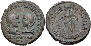 | Lot description: THRACE, Anchialus. Gordian III, with Tranquillina. AD 238-244. Æ Tetrassarion (25mm, 11.50 g, 6h). Laureate, draped, and cuirassed bust of Gordian and draped bust of Tranquillina, wearing stephane, facing one another / Nemesis standing left, holding scales and parazonium; wheel to left. Varbanov 772 var. (obv. legend). VF, brown patina. Estimate: 100 USD |