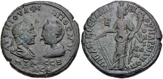 | Lot description: MOESIA INFERIOR, Marcianopolis. Philip I, with Otacilia Severa. AD 244-249. Æ Pentassarion (27mm, 15.74 g, 7h). Prastina Messallinus, legatus consularis. Struck AD 244-247. Laureate, draped, and cuirassed bust of Philip and draped bust of Otacilia Severa, wearing stephane, facing one another / Fortuna standing left, holding rudder and cornucopia; E (mark of value) to left. Cf. H&J, Marcianopolis 6.41.38.1-3; Varbanov 2086. VF, green patina, some roughness and scratches. Estimate: 100 USD |